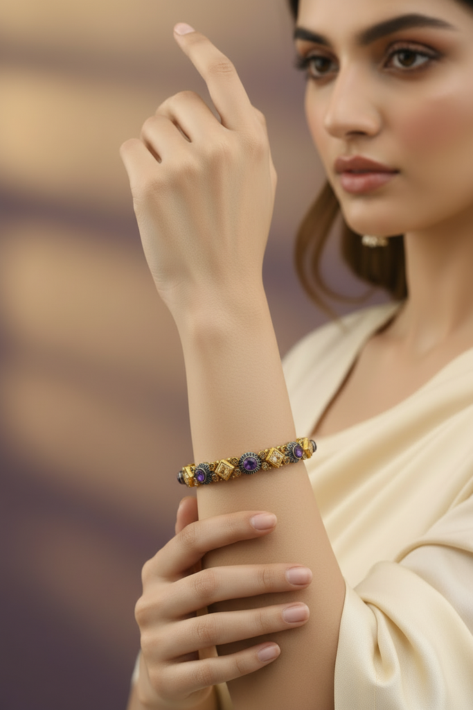22k high quality gold + rhodium plated hand crafted bangle studded with real stones.