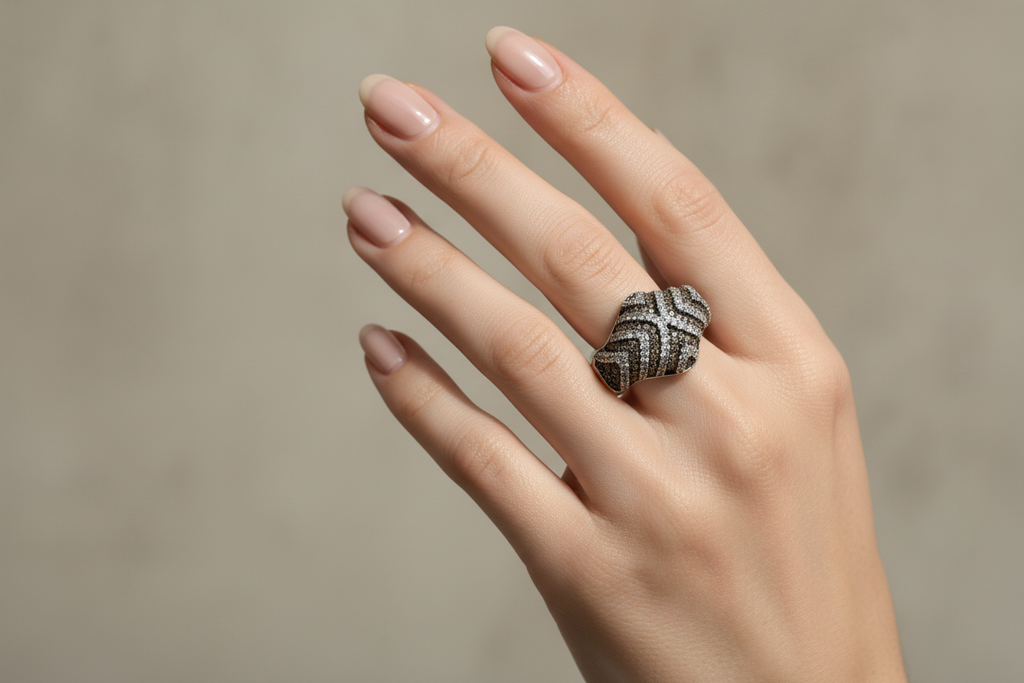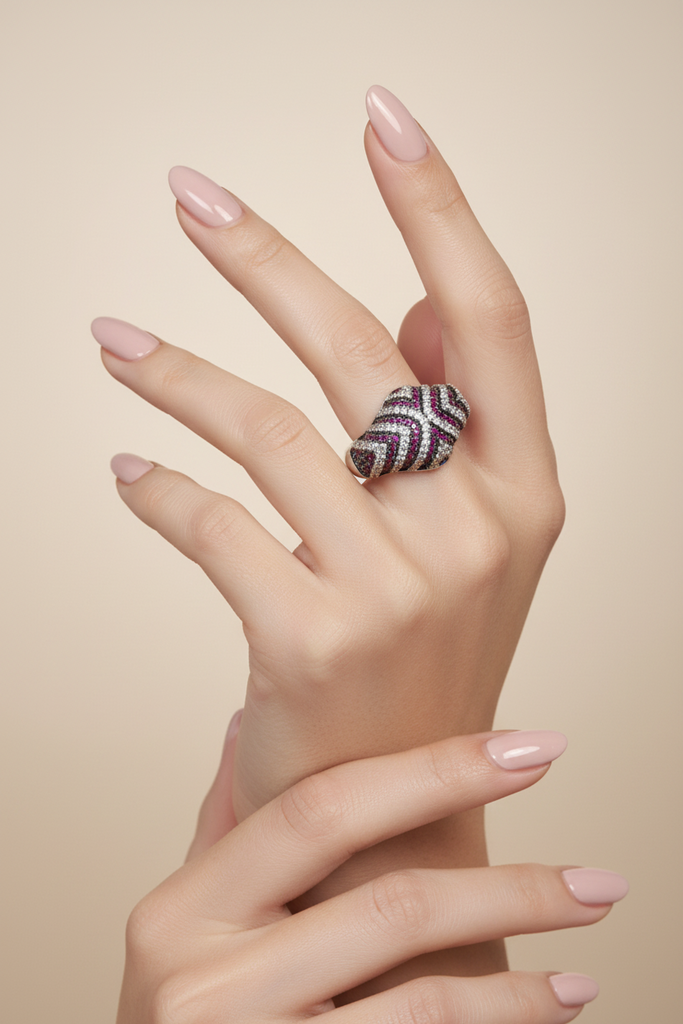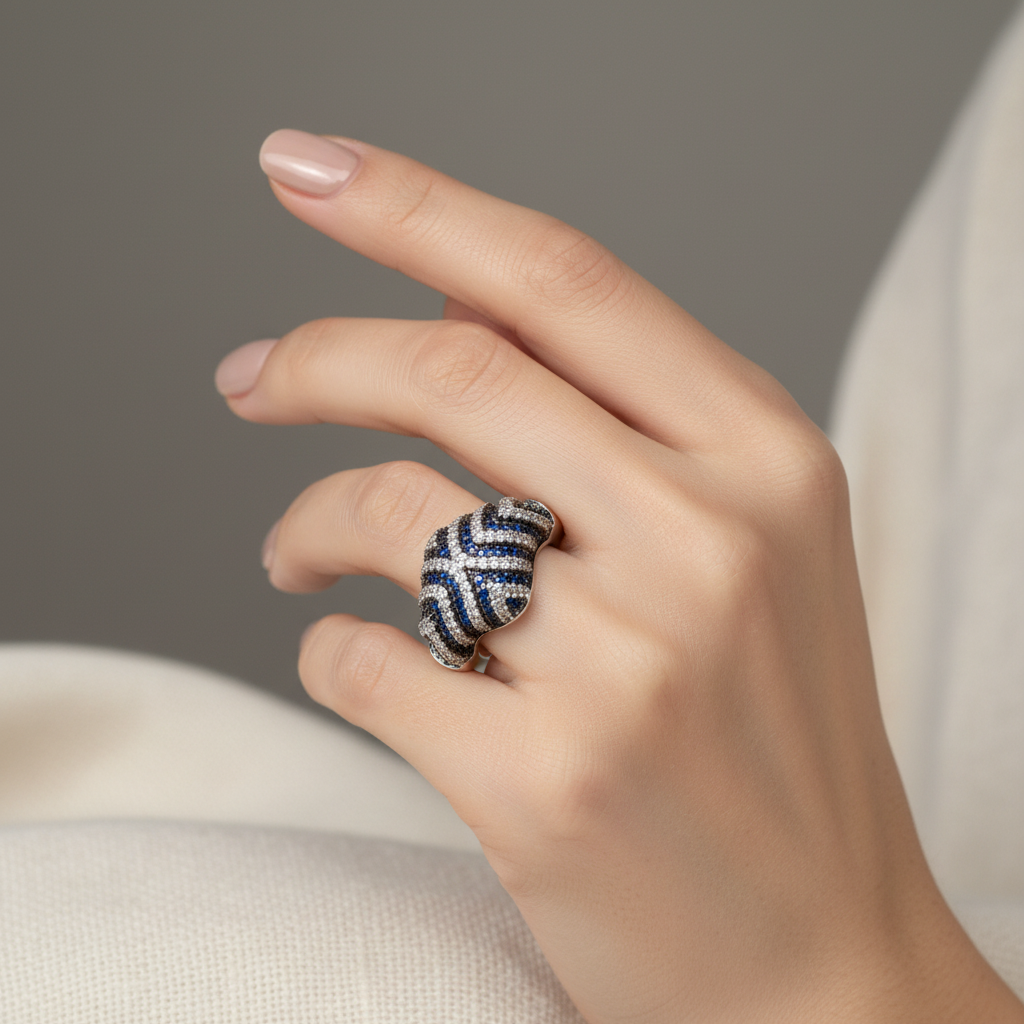 High quality rhodium plated ring studded with micro zircons and real stones.