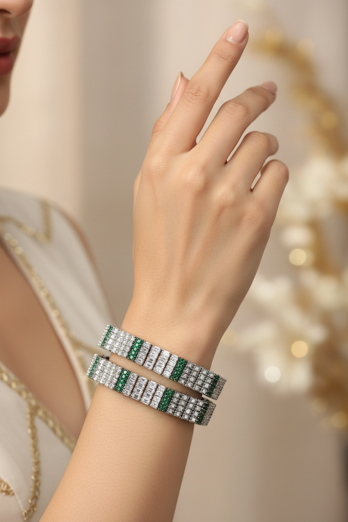 High quality rhodium plated bangle studded with precious zircons and real stones.