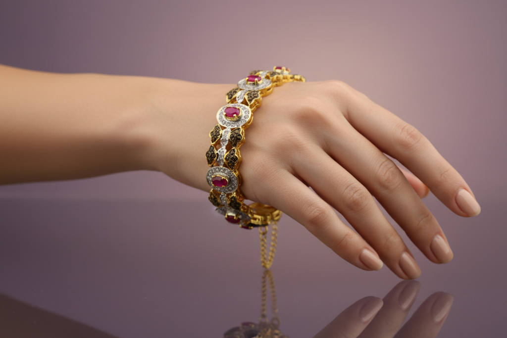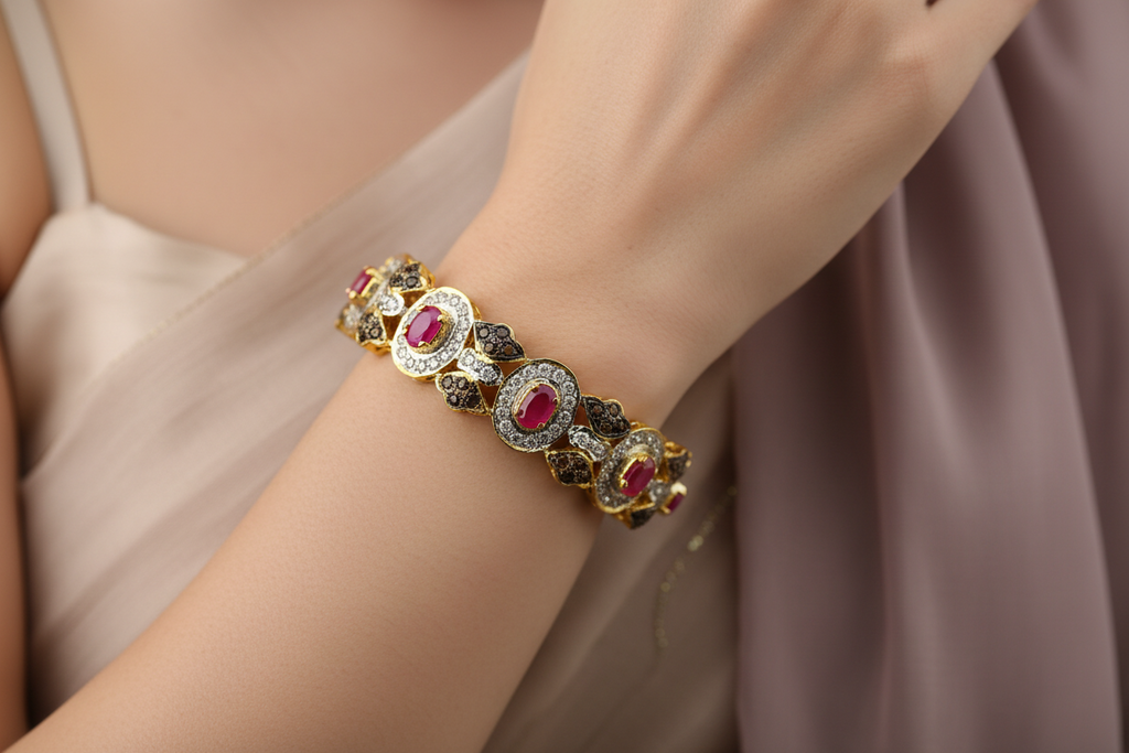 22k high quality gold + rhodium plated openable bangle studded with precious zircons and precious stones.