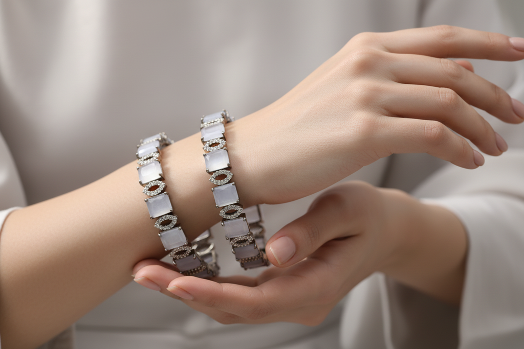 High quality rhodium plated bangle pair (2) studded with precious zircons and real stones.