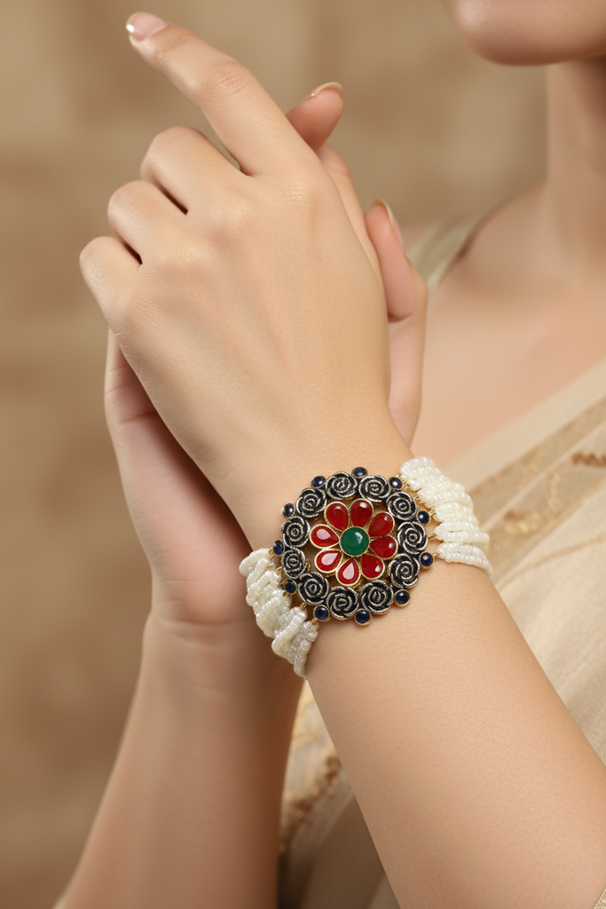 22k high quality gold + rhodium plated high quality signature bracelet studded with real stones and pearl beads