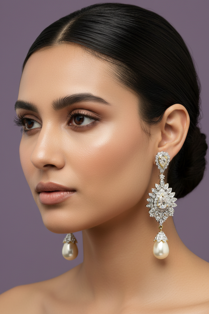 High quality gold + rhodium plated earrings studded with precious zircons and real stones.