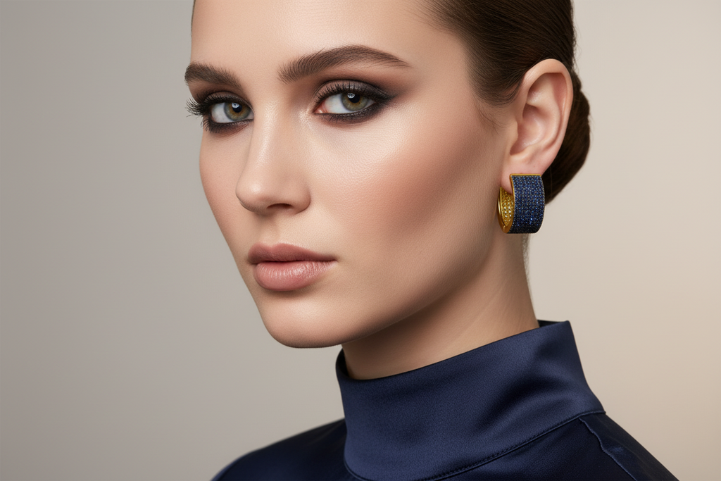 High quality gold + rhodium plated earrings (bali) studded with precious stones.