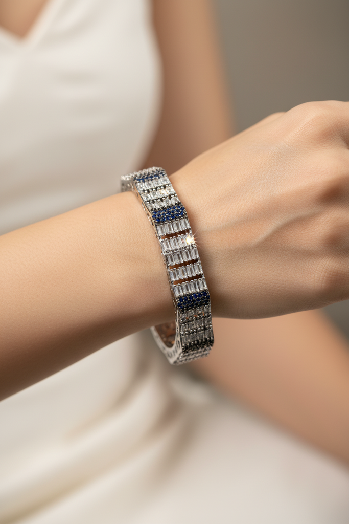 High quality rhodium plated bangle  studded with precious zircons and real stones.