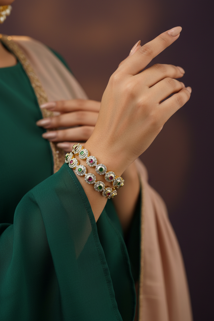 High gold + quality rhodium very elegant and beautiful diamond style bangles pair studded with precious zircons and stones.