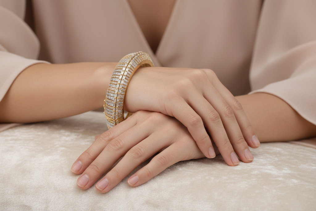 High gold + quality rhodium very elegant and beautiful openable bangle in Rose Gold Polish studded with precious zircons.