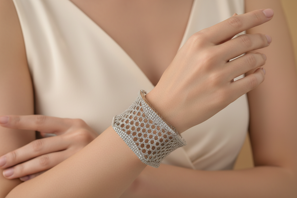 High quality rhodium plated diamond design openable bangle studded with precious micro zircons.