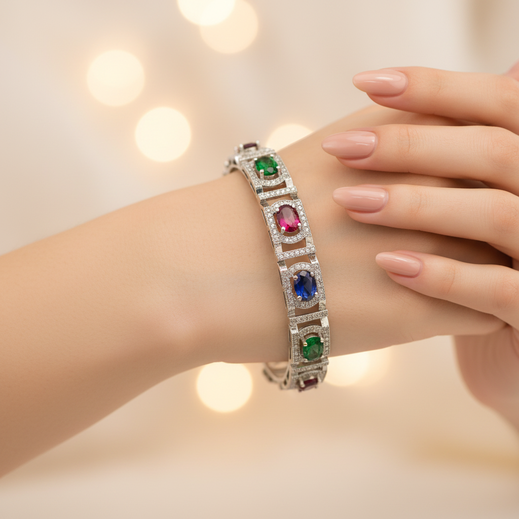 High quality rhodium very elegant and beautiful openable bangle studded with precious zircons and stones.