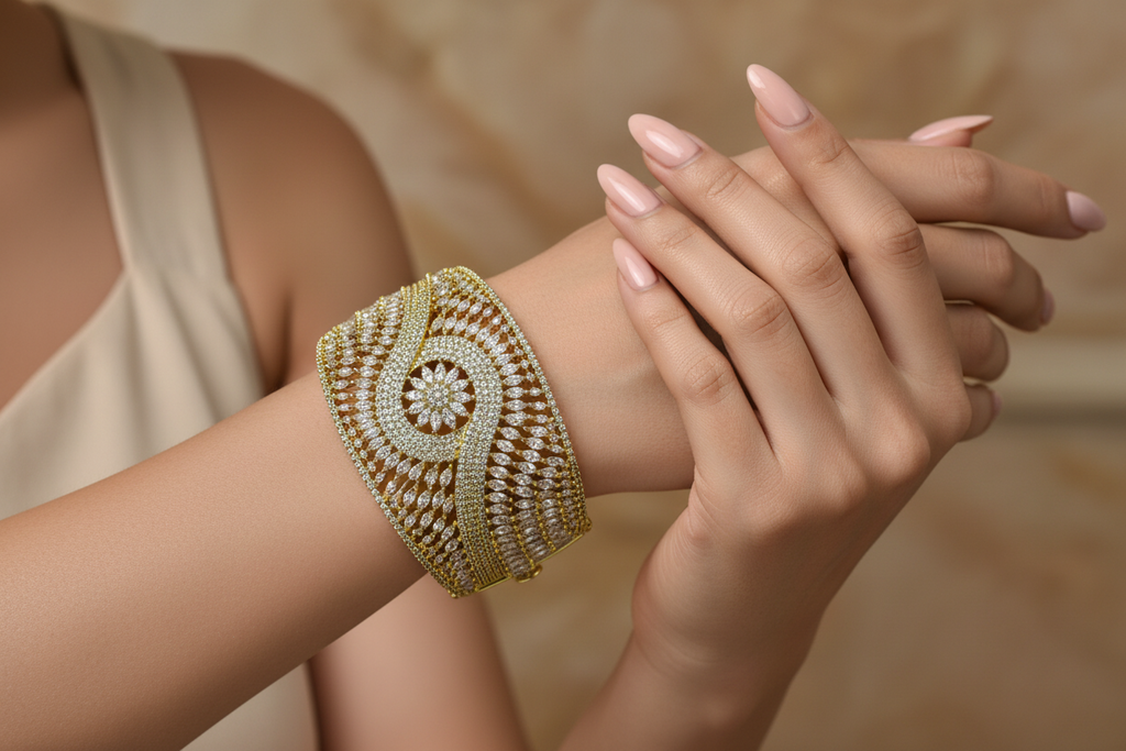High quality gold + rhodium plated diamond design openable bangle studded with precious zircons.