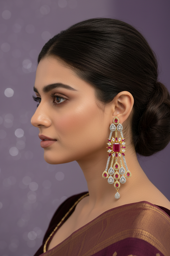 High quality gold + rhodium plated earrings studded with precious zircons and real stones.