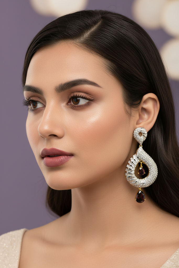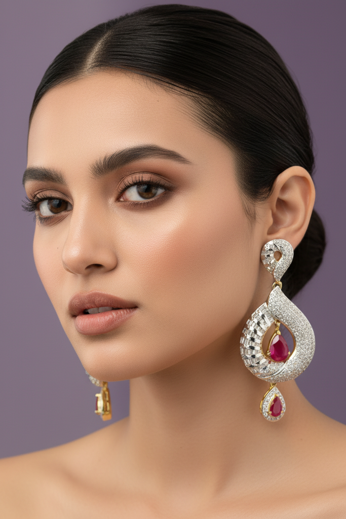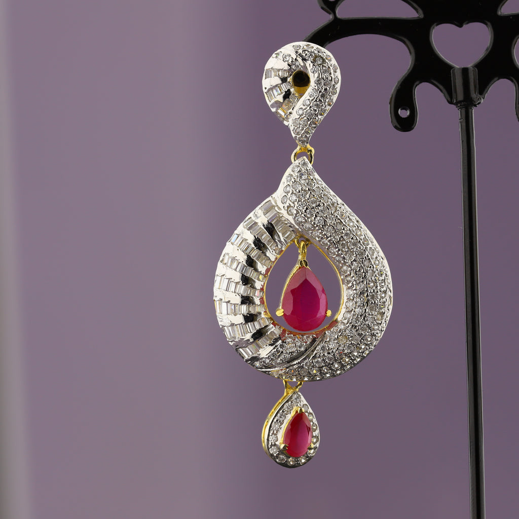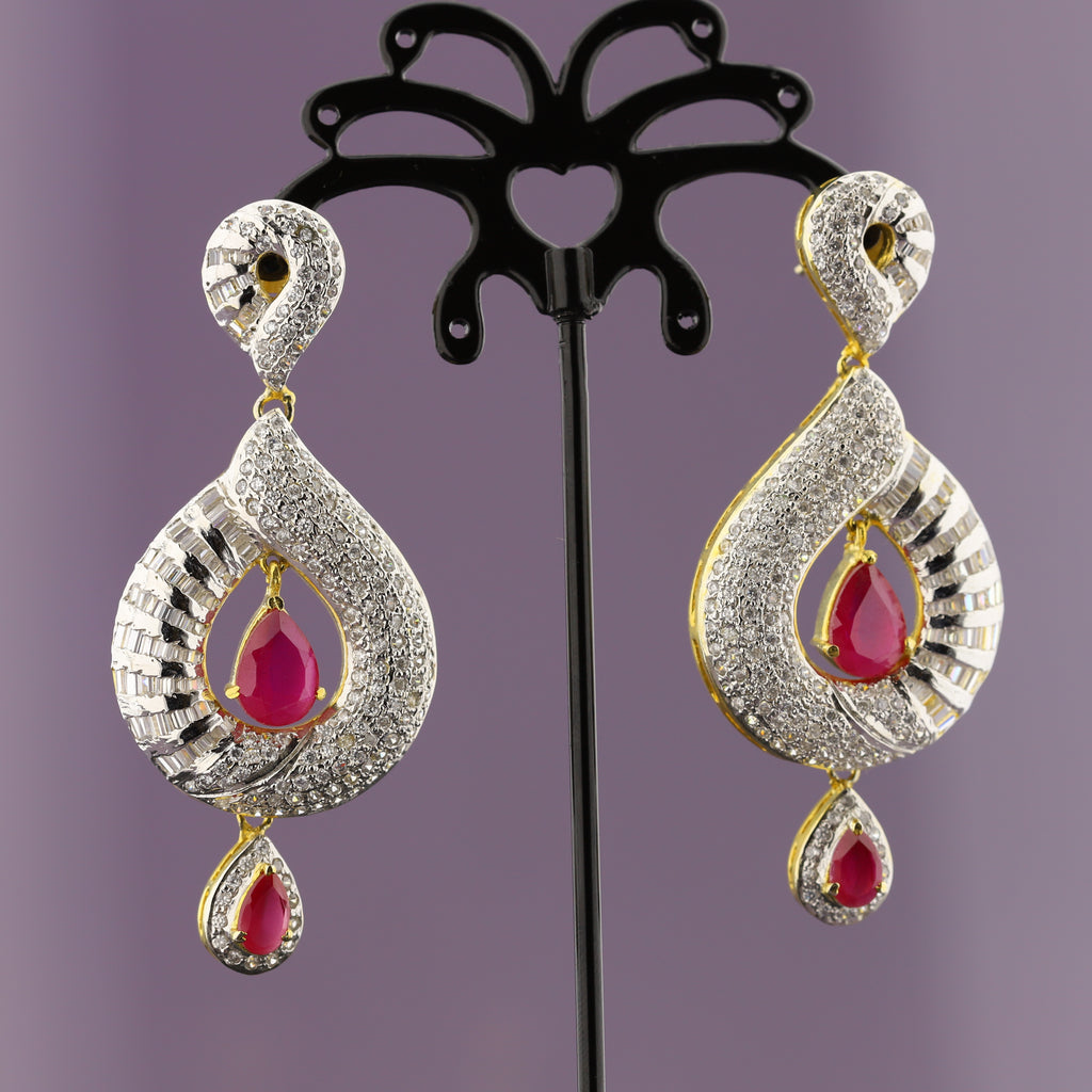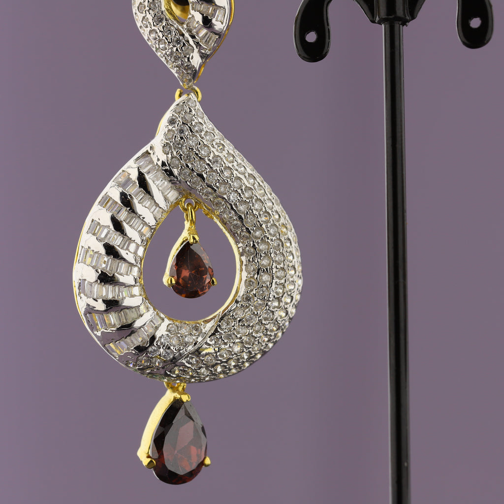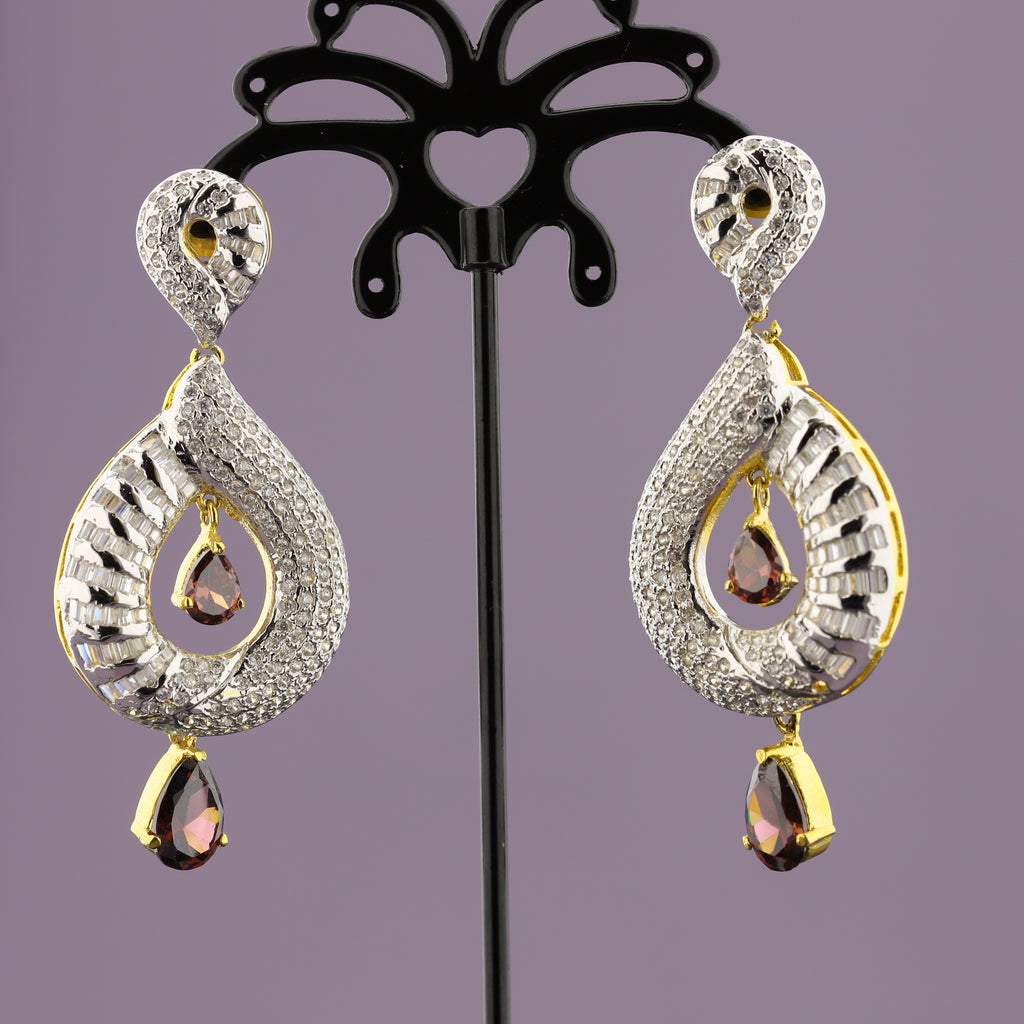 High quality gold + rhodium plated earrings studded with precious zircons and real stones.