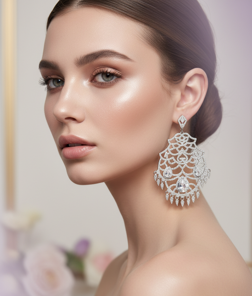 High quality rhodium plated earrings studded with precious zircons and real stones.