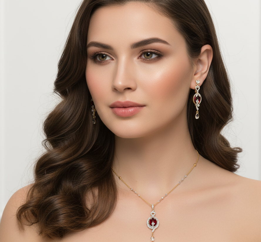 High quality gold + rhodium plated (5 in 1) very beautiful and elegant Pendant set studded with precious zircons and real stones.