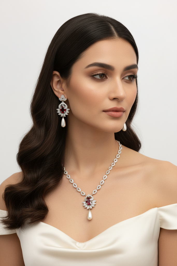 High quality gold + rhodium plated (5 in 1) very beautiful and elegant Necklace set studded with precious zircons and real stones.