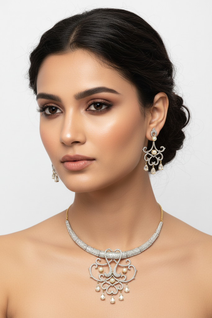 22k gold + rhodium plated very beautiful and elegant necklace set studded with precious zircon and real stones.