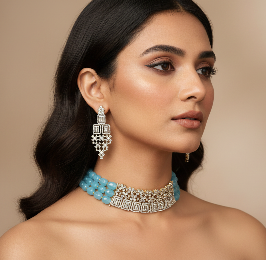 22k gold plated very beautiful and elegant choker patti set studded with precious and tapered zircon and precious feroza beads.