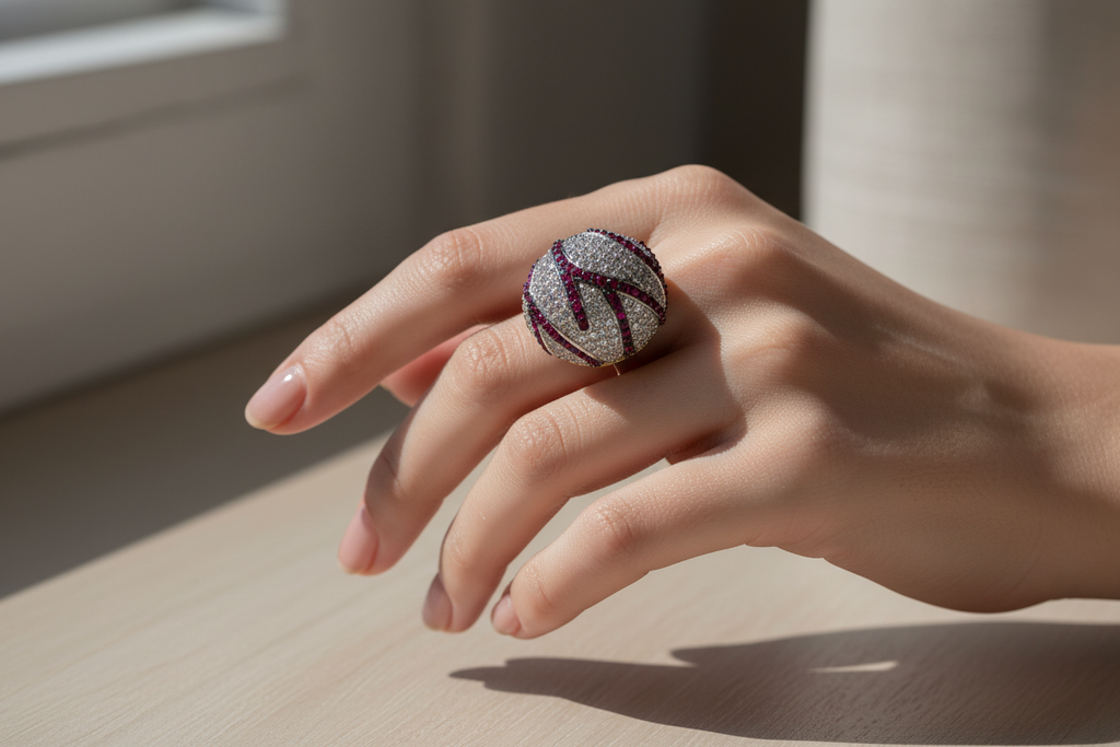 22k gold + rhodium plated ring studded with micro zircons and real stones.