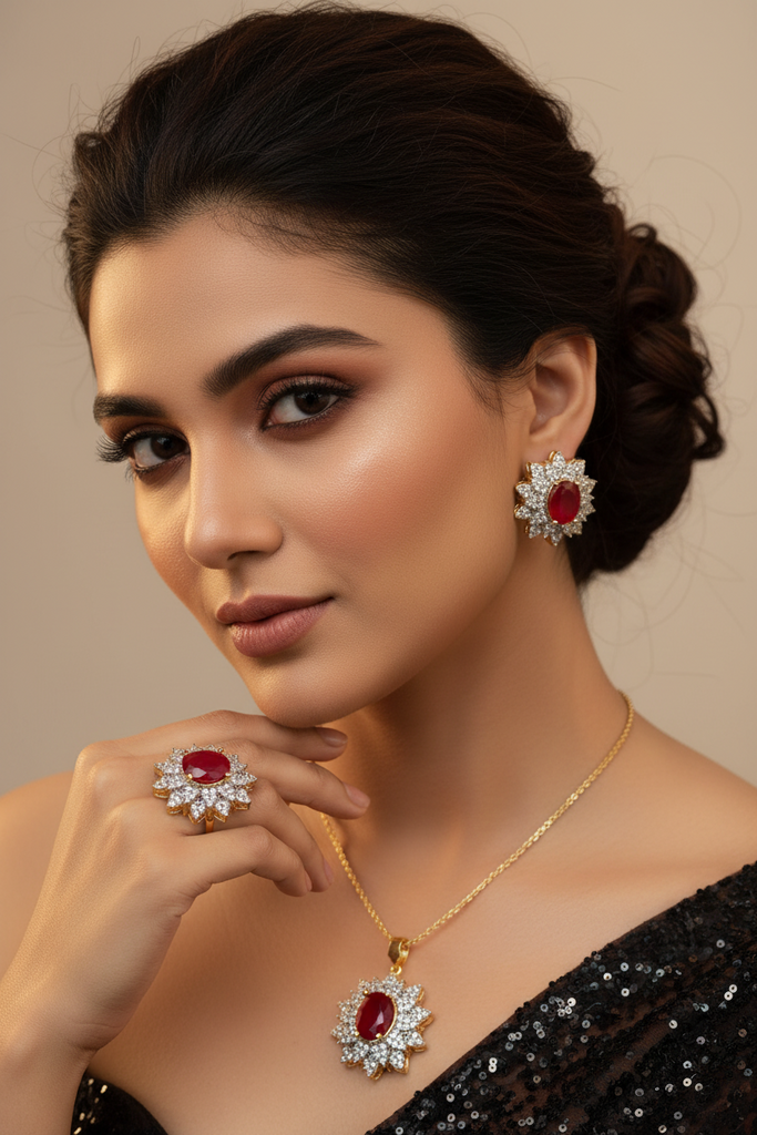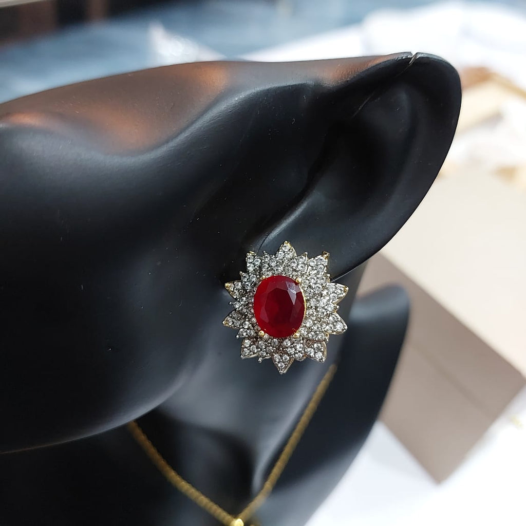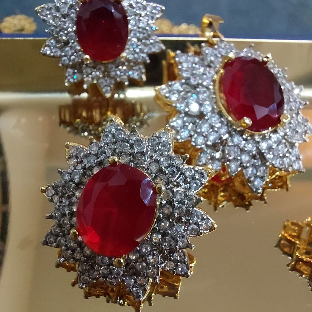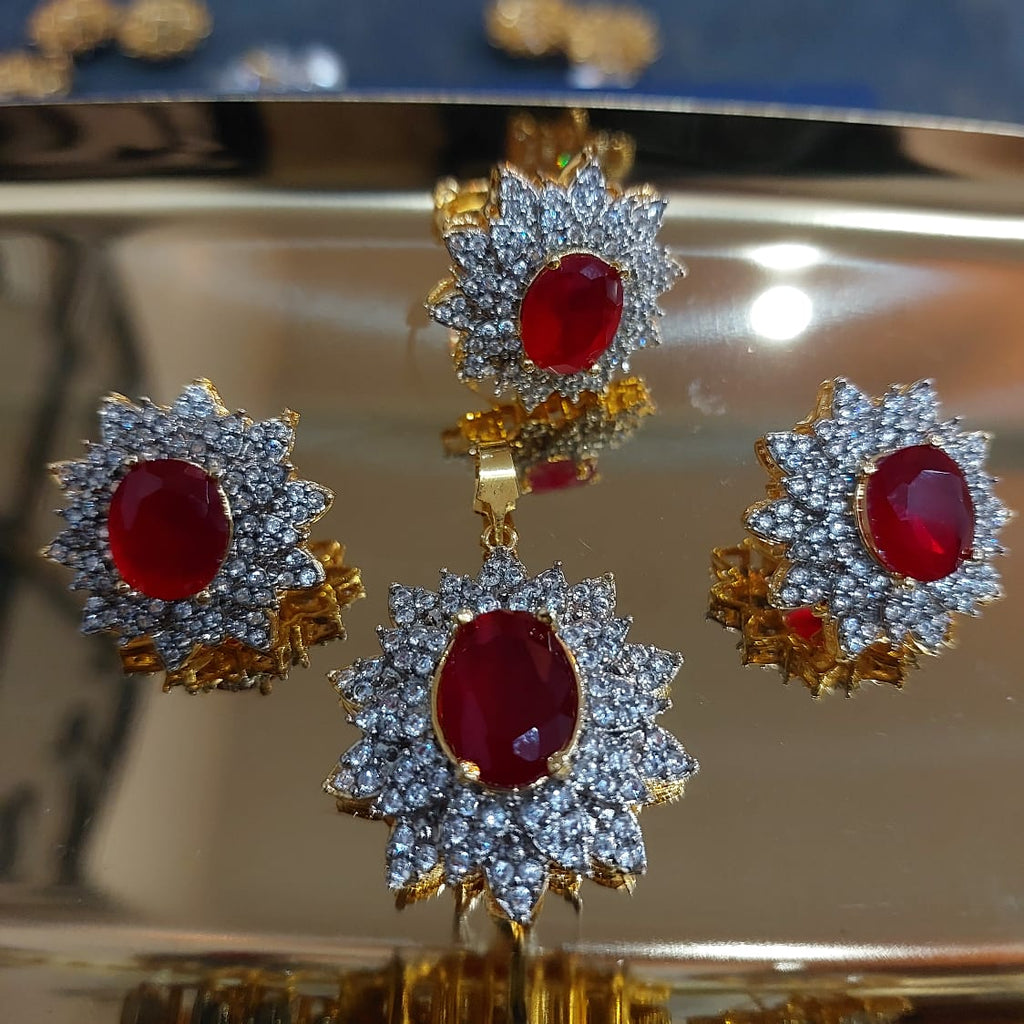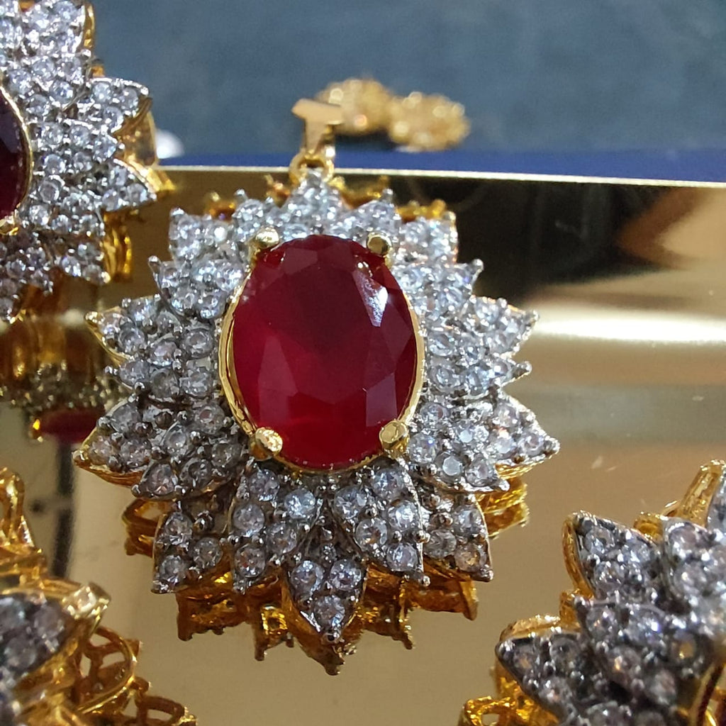 22k Gold plated and rhodium plated high quality pendant set studded with precious zircons and real ruby stones.