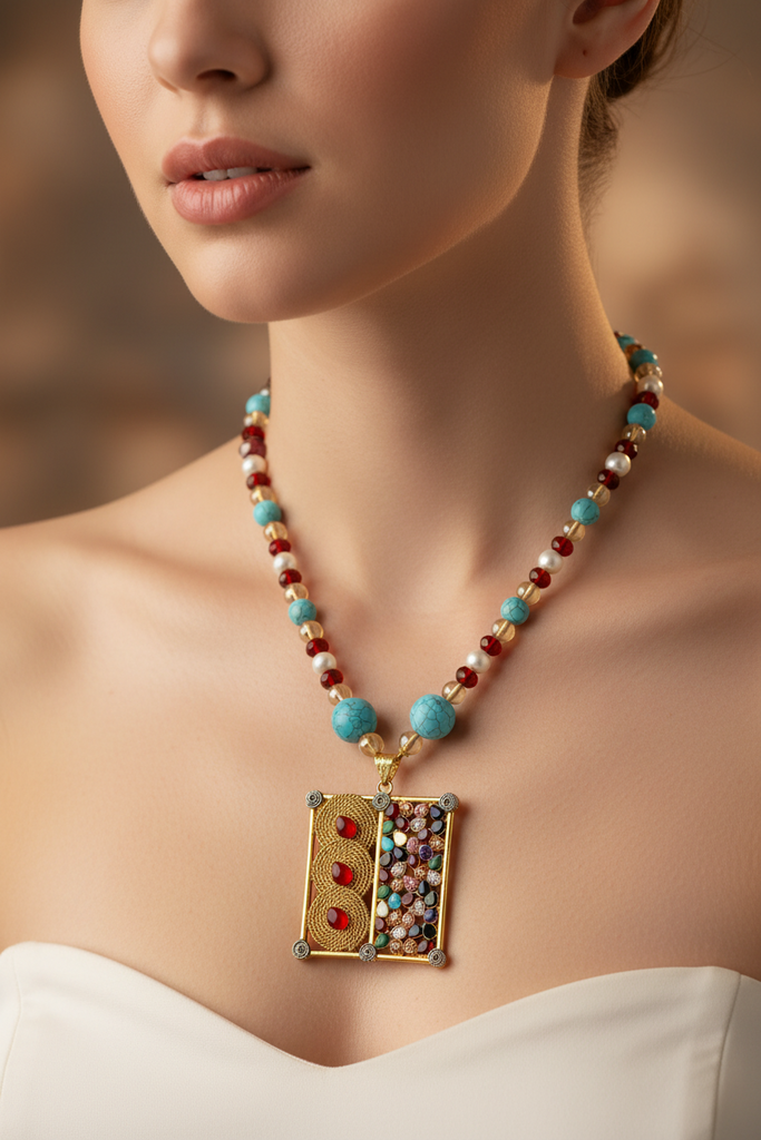 22k high quality gold + rhodium plated hand crafted pendant studded with real stones and beads.