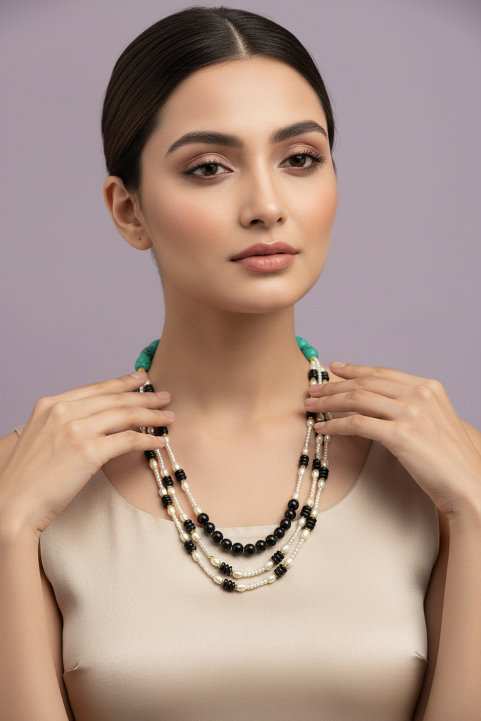 Premium quality long length Mala studded with real pearls and real feroza, black onyx beads.