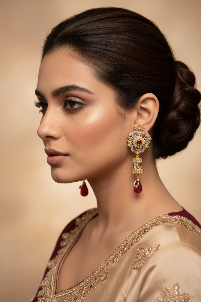 22k gold + rhodium plated high quality long length earrings studded with precious zircons and real stones.