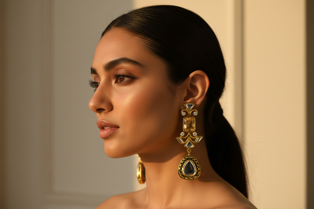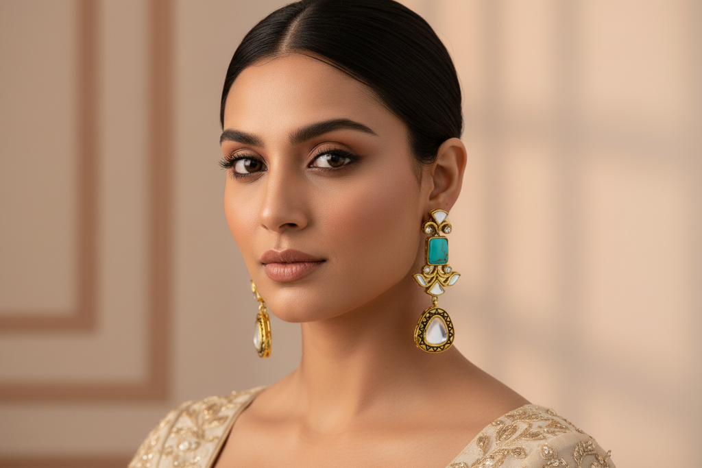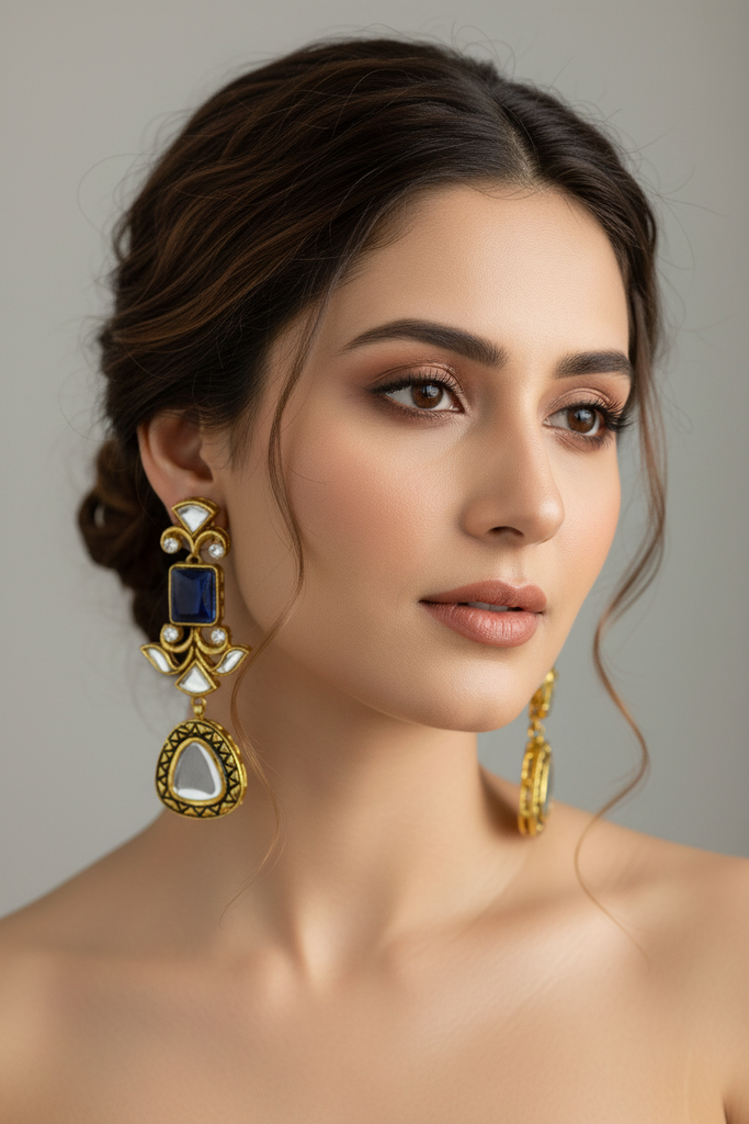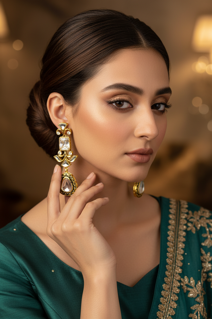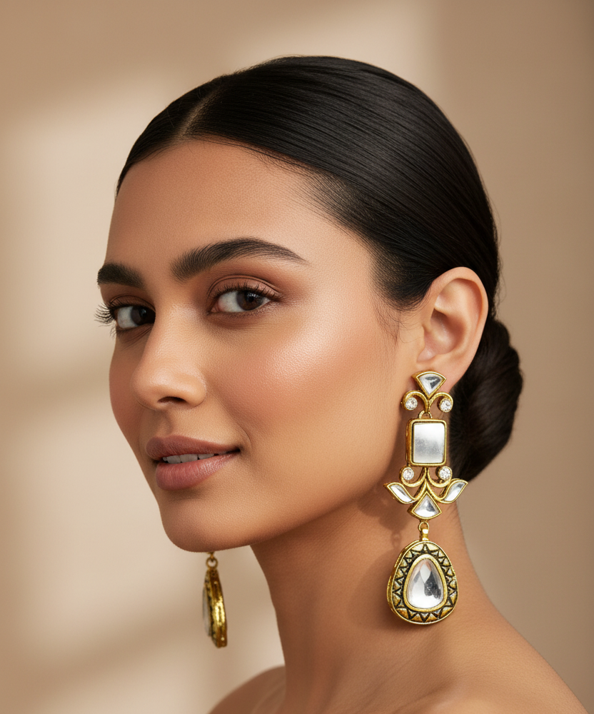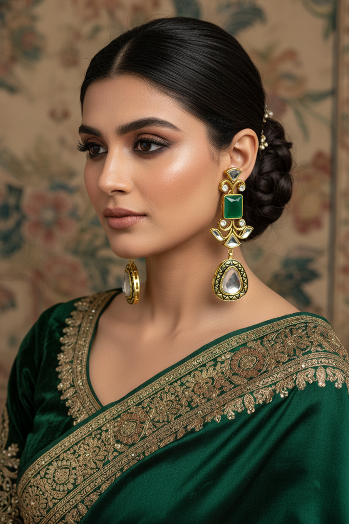 22k gold + rhodium plated high quality earrings studded with real stones and real sheesha kundun stones.
