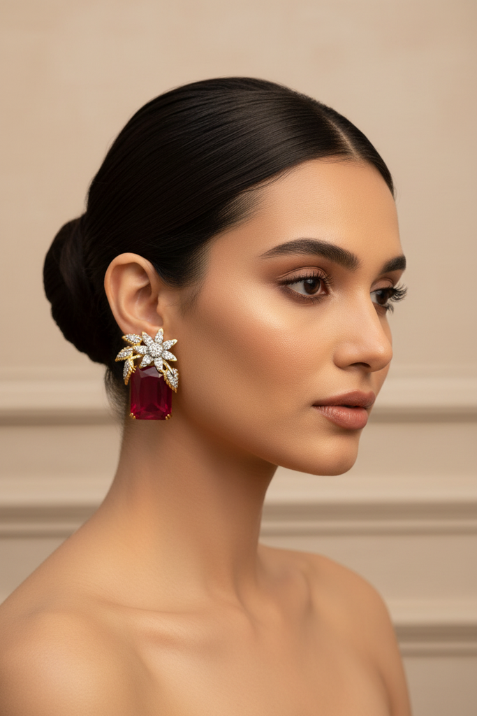 22k gold +rodhium plated very elegant and beautiful party wear earrings studded with real precious zircons and real stones