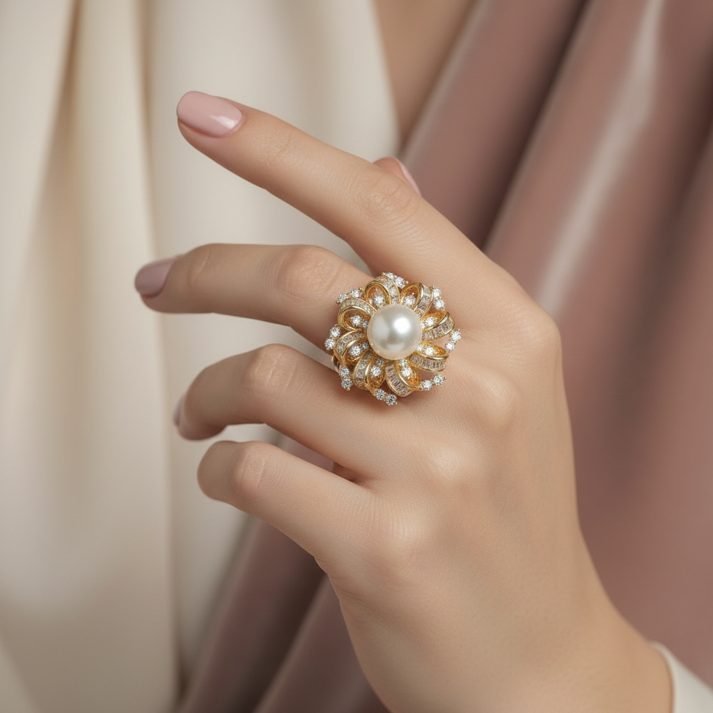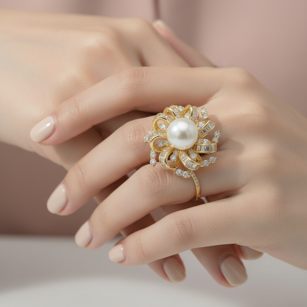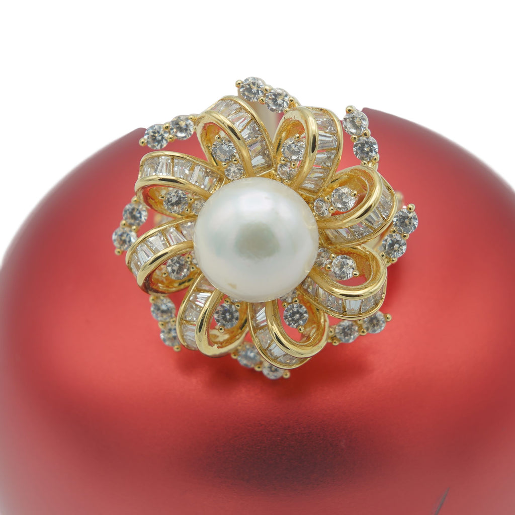 High Quality gold plated and rodhium plated premium quality ring studded with real precious zircons and real pearls