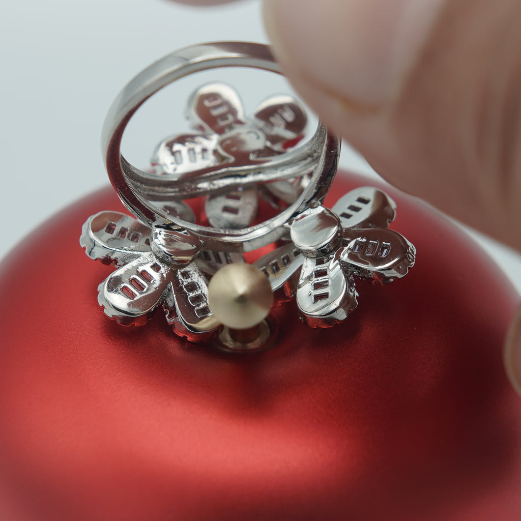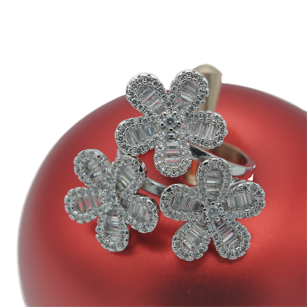 High quality rodhium plated very beautiful flower ring studded with real precious zircons and tapers