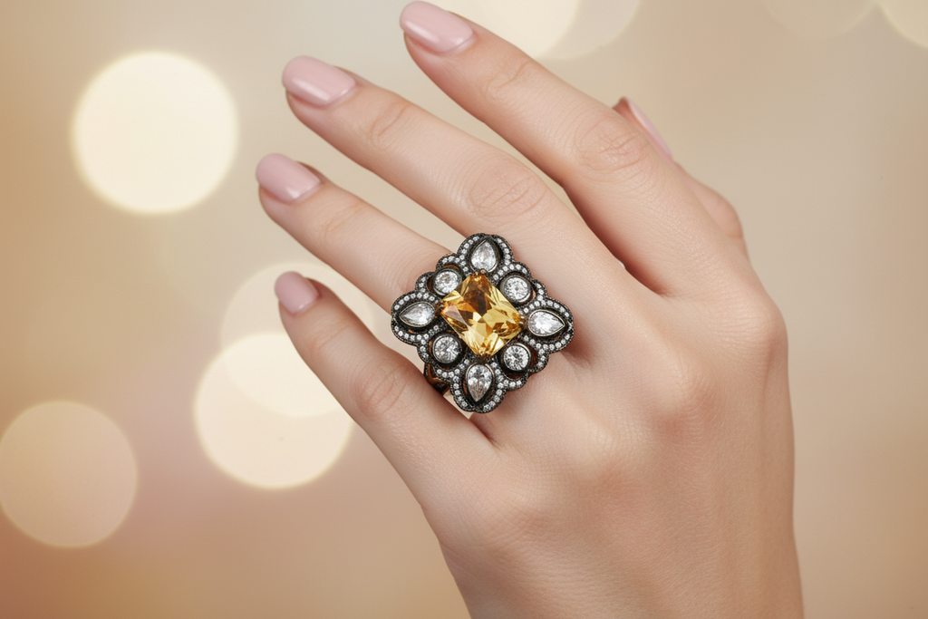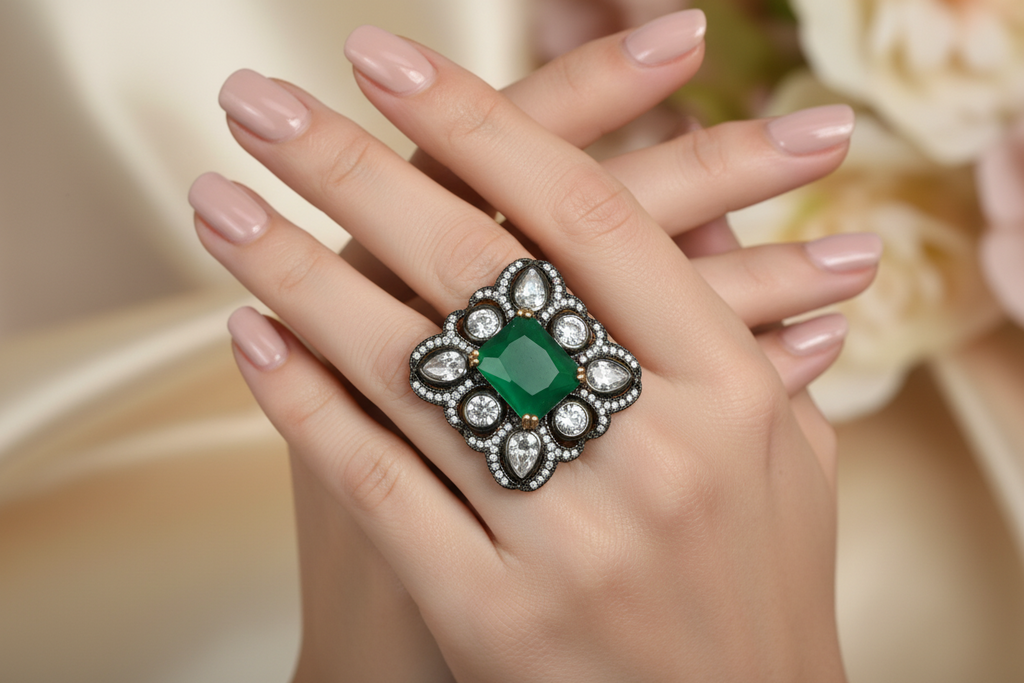 22k gold and rhodium plated elegant ring studded with finest micro zircons and real centered stones.
