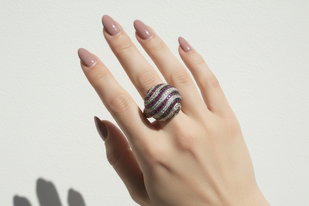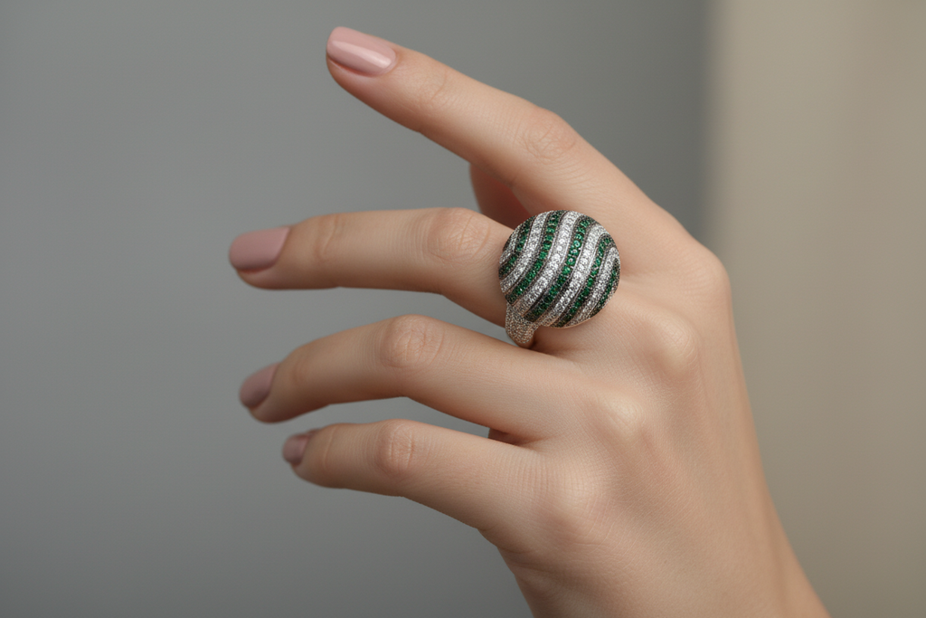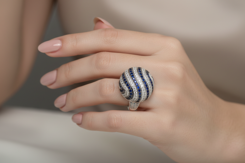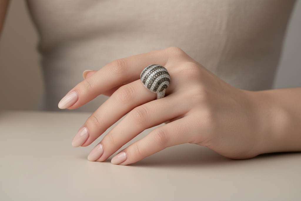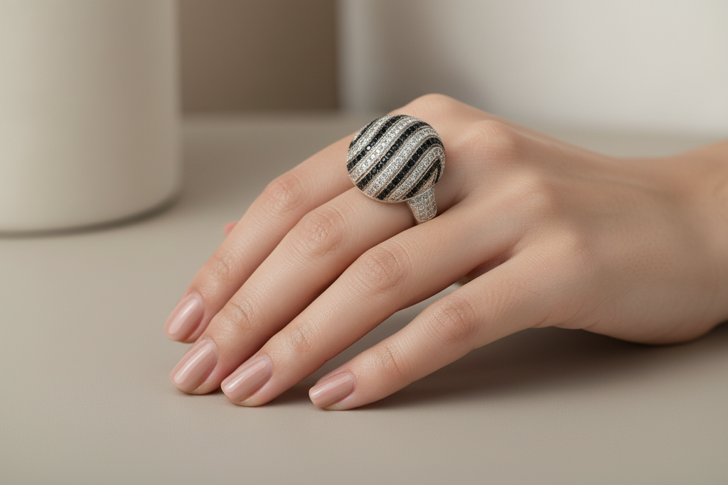 Two Tone (White & Black) rhodium plated elegant ring studded with finest micro zircons and real stones