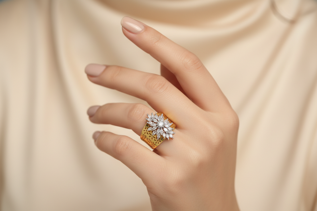 22k gold plated and rodhium plated diamond design laser cut band ring studded with real precious zircons. Premium quality👍