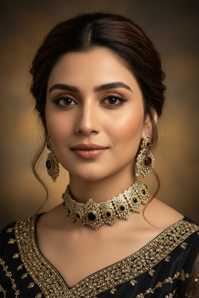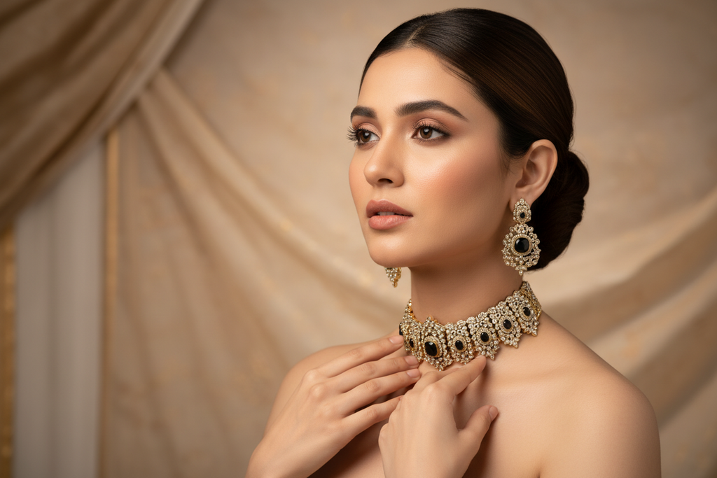 22k high quality gold + rhodium plated very beautiful choker set studded with real stones and precious zircons.