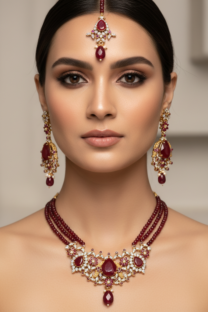 22k high quality gold + rhodium plated two tone necklace set studded with precious zircons and stones and precious ruby beads.