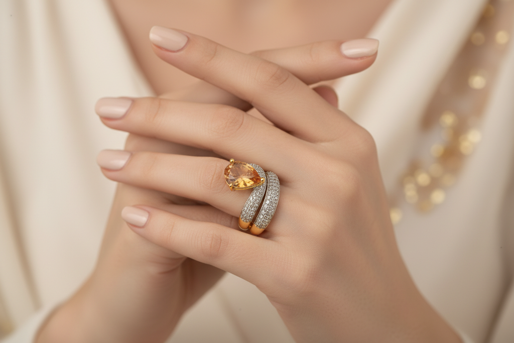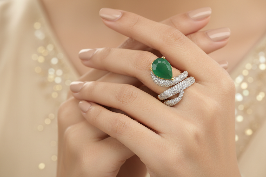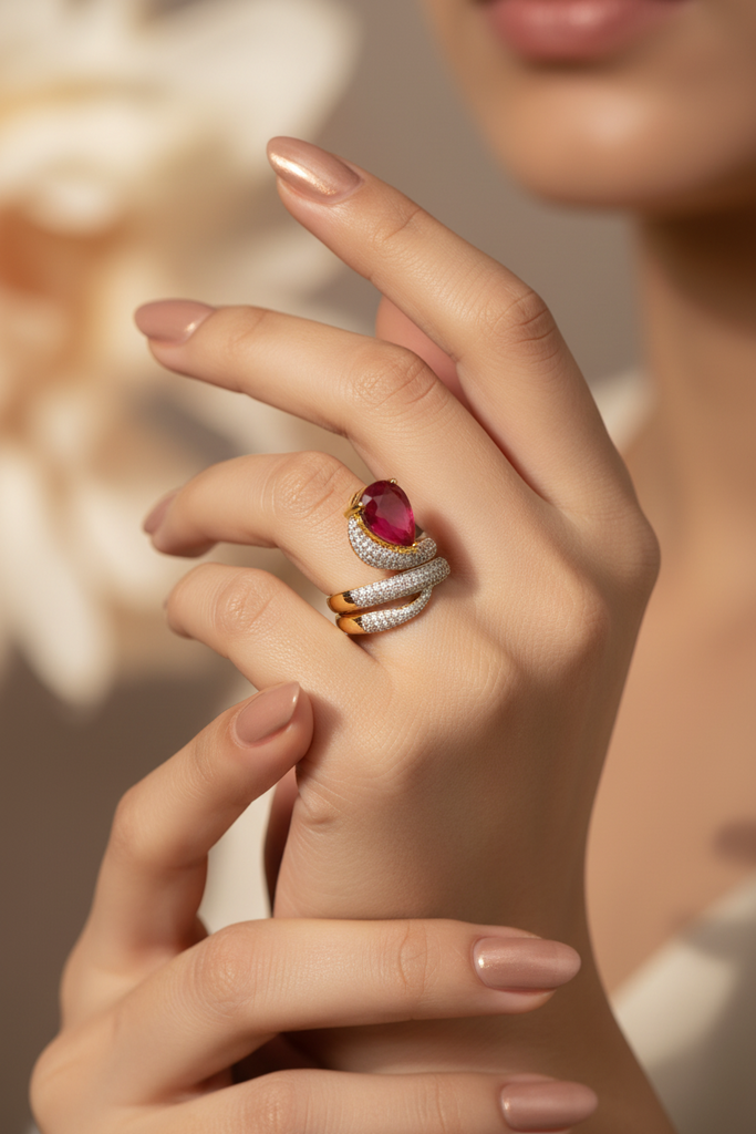 22k high quality gold + rhodium plated elegant ring studded with precious zircons and real stones.