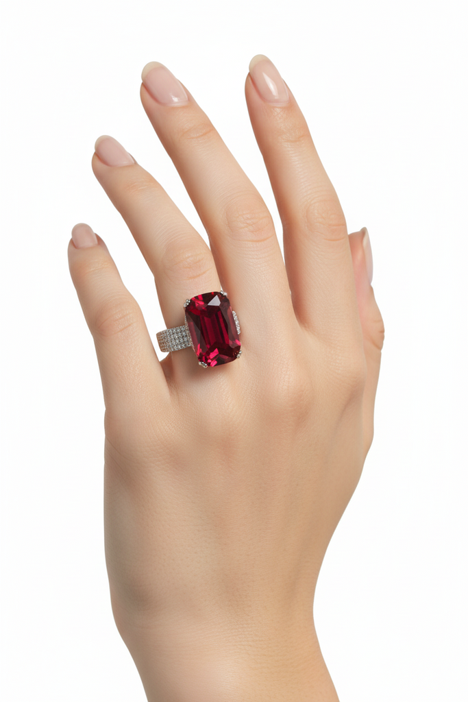 High quality rodhium plated double casted adjustable Italian🇮🇹 ring studded with precious micro zircons and real premium quality Ruby Light Tourmaline stone. Royal Ring🥰
